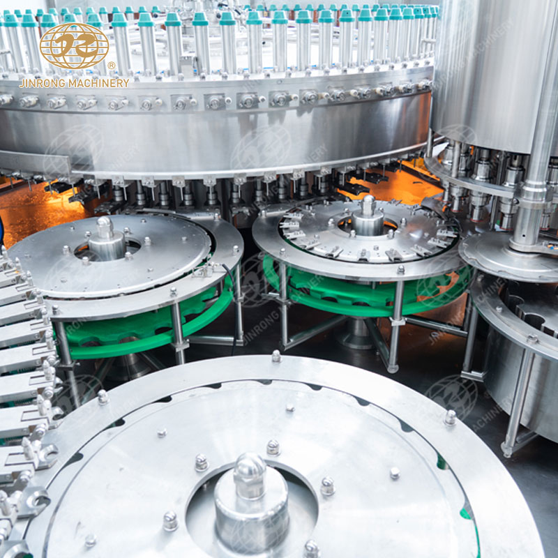 3. 灌裝:在接下來(lái)的工作站,經(jīng)過(guò)定量灌裝設(shè)備,將碳酸飲料按照預(yù)設(shè)的容量精確地灌裝入瓶子中。灌裝設(shè)備通常采用重力式下料或者壓力式下料,保證了灌裝的準(zhǔn)確性和穩(wěn)定性。